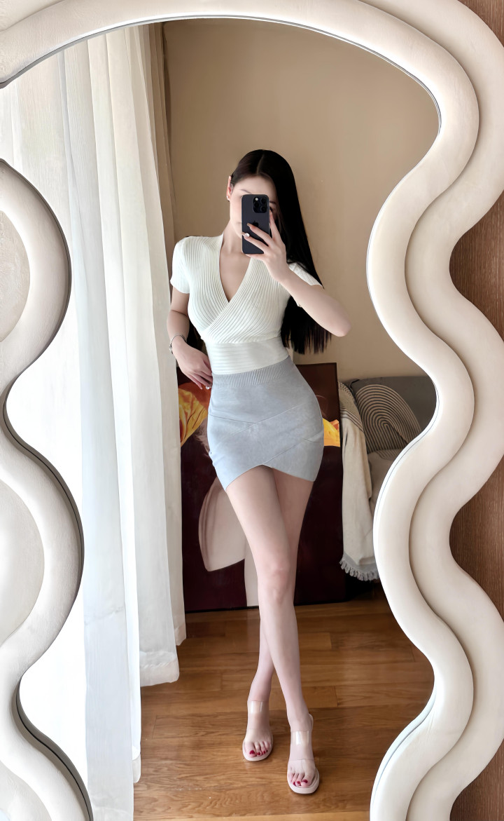 镜前轻抚腰间,V领褶纹上衣勾勒锁骨线条。浅灰高腰短裙裹挟长腿杀,透明高跟延伸优雅比例。黑长发垂落肩头,从容姿态自成焦点,这身穿搭让成熟气质杀疯了!